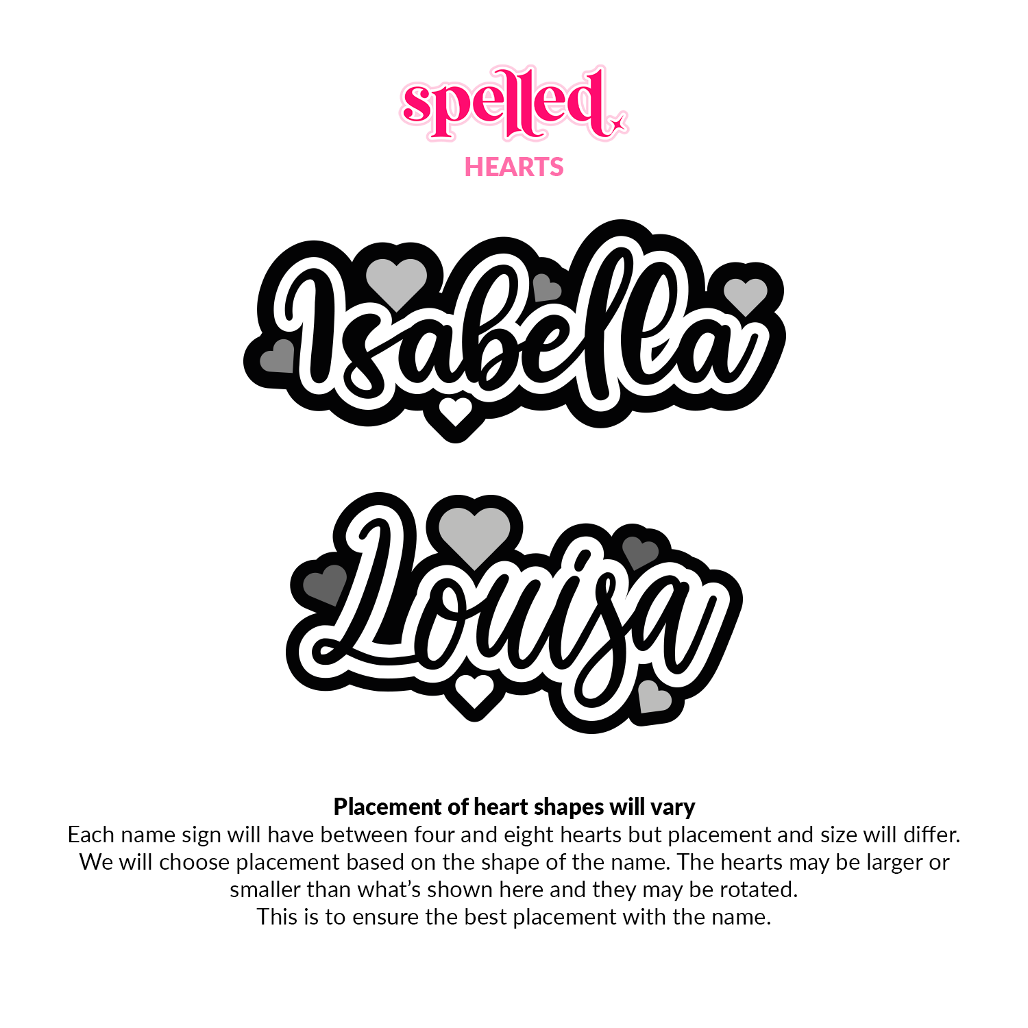 We will apply around 4-8 hearts to your name sign. Placement and size will differ. We will choose placement based on the shape of the name. The hearts may be larger or smaller than what’s shown here and they may be rotated. This is to ensure the best placement with the name.