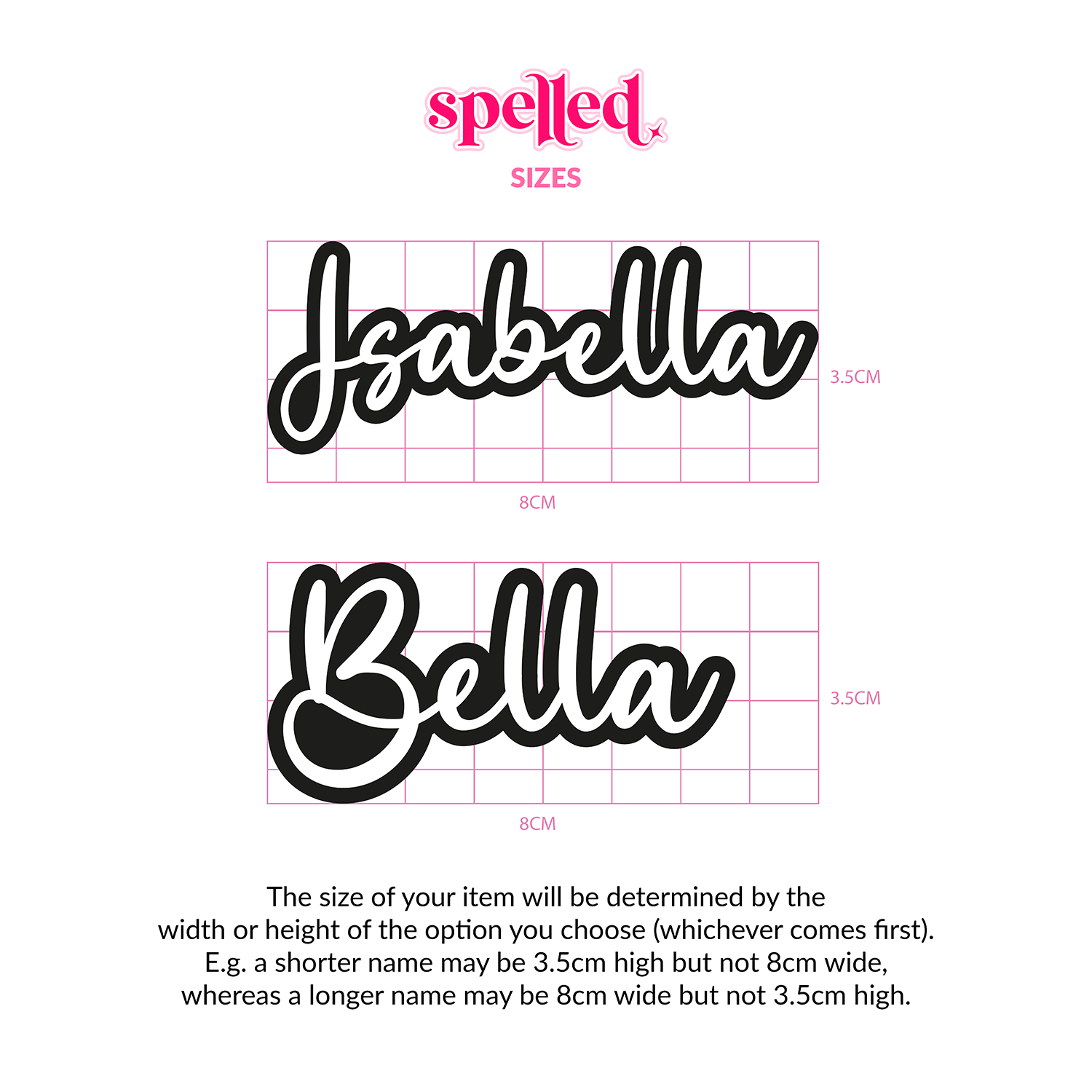 The name is up to 8cm wide or 3.5cm high (whichever comes first). The loop, ribbon and snowflake are in addition to that sizing so the final product will be a bit bigger, either higher or wider depending on snowflake placement.